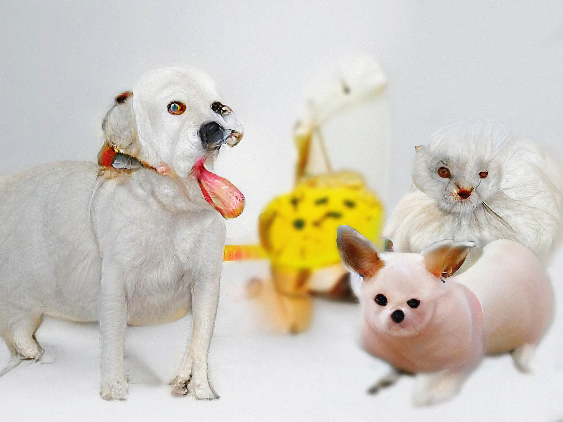 A series of (mostly) AI produced photo prints by Hannes Arvid Andersson showing fictional animal crossover breeds, presented at Art Away art fair Groningen.