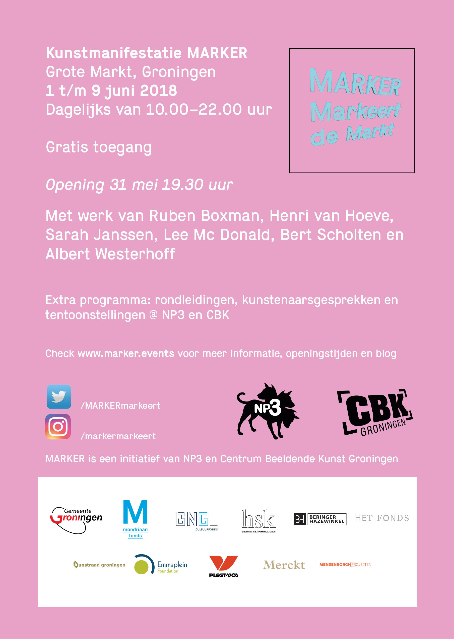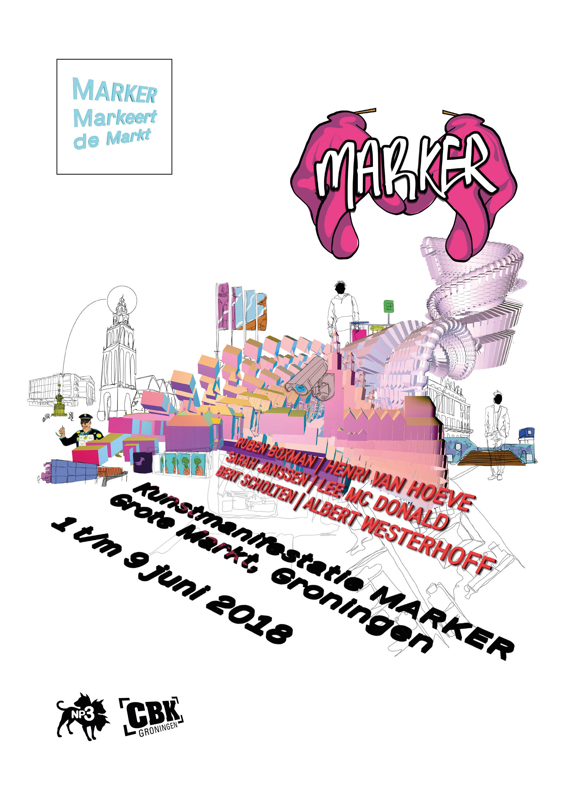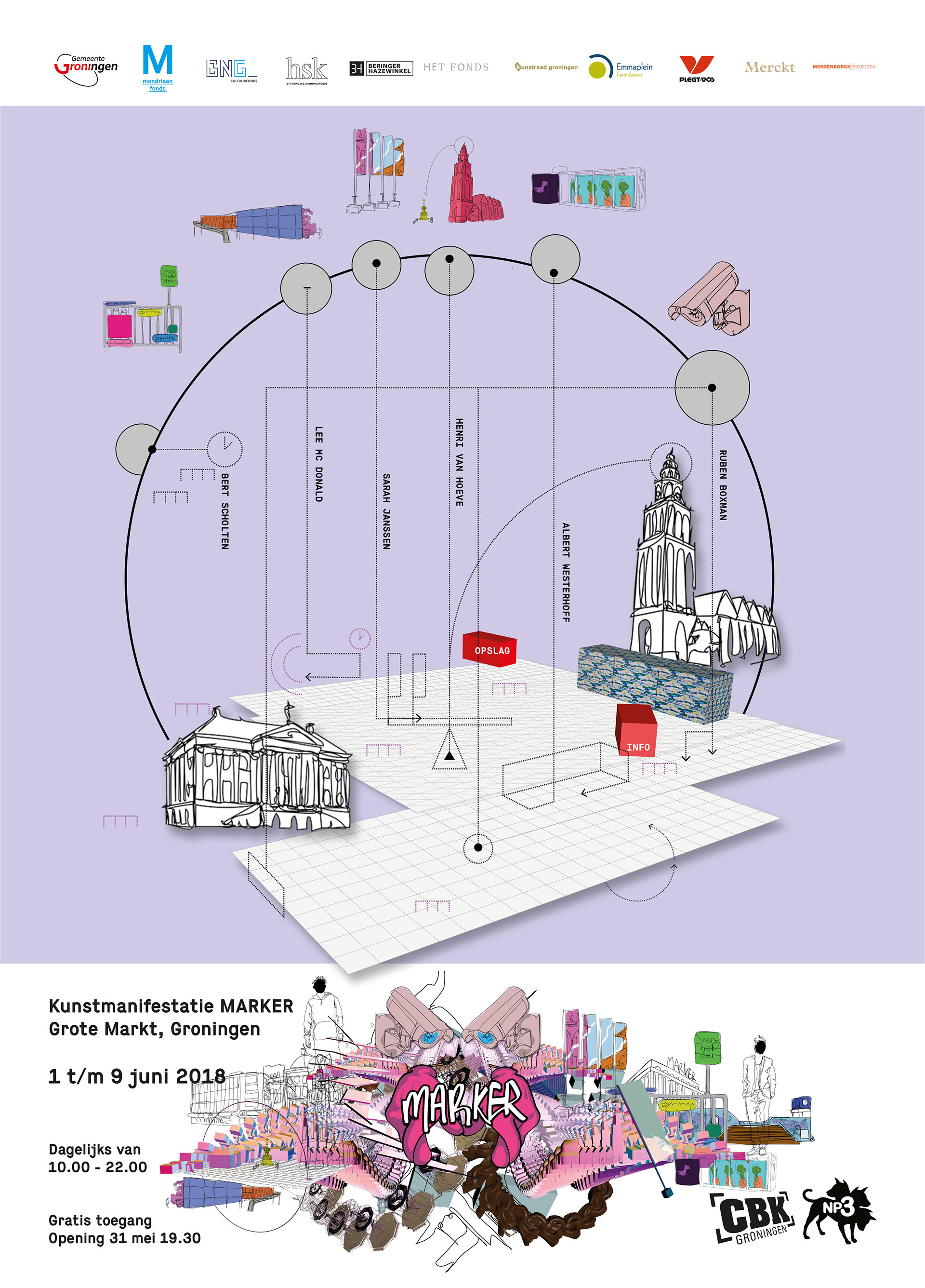 MARKER was a ten-day art manifestation held from May 31 to June 9, 2018, transforming the Grote Markt into a stage for contemporary art. Six artists explored the square’s historical and cultural significance, creating site-specific works that engaged visitors in new perspectives on urban space. The project was a collaboration between NP3 and CBK Groningen, combining their expertise in supporting and showcasing experimental and contemporary visual arts in the Northern Netherlands.