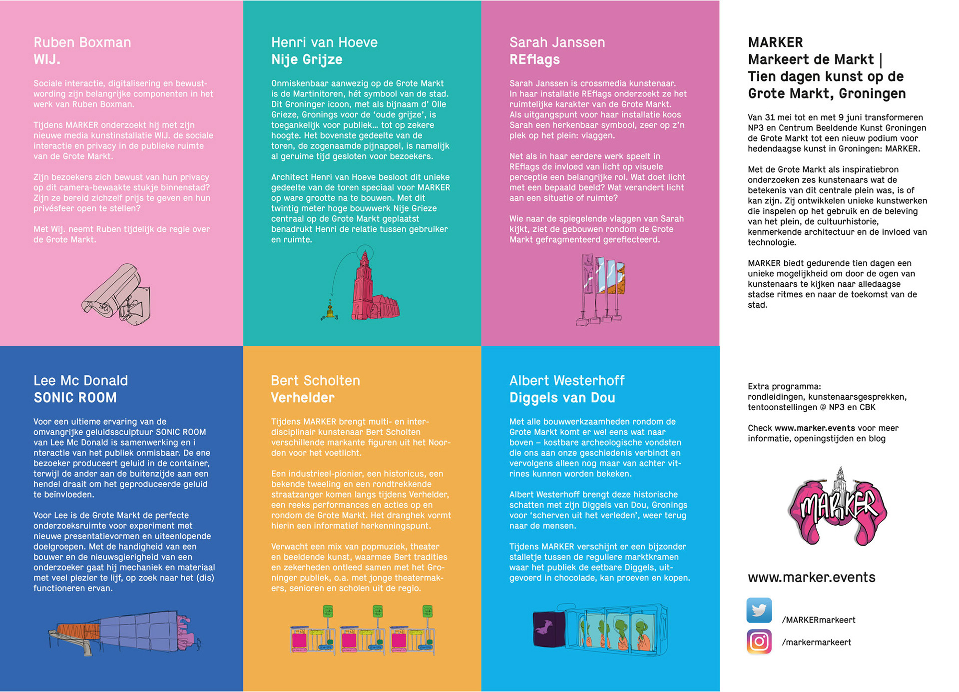 The visual identity for MARKER was developed to reflect its mission: bringing contemporary art to a broad audience in an open and accessible way. As the manifestation took place on Groningen’s central square, the Grote Markt, the design aimed to be playful, fresh, and dynamic, drawing inspiration from graffiti, sketch illustration, and contemporary graphic design. By incorporating a vibrant and layered aesthetic, the branding conveyed a sense of movement and spontaneity, mirroring the diversity of artistic expressions presented at the event.