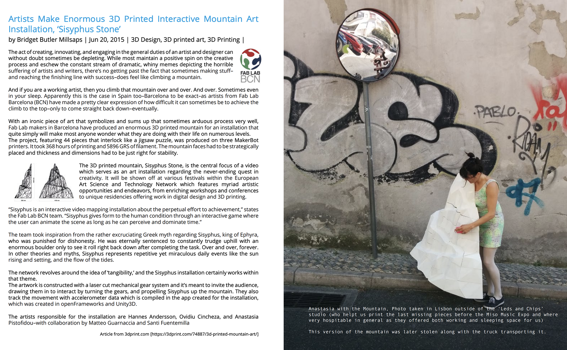 MISO Music (Lisbon, 2015), Avarts festival (Corfu, 2015), Globale Digitale @ ZKM (Karlsruhe, 2015), as well as Festival Internacional Mapping Girona (Girona, 2015) where it was nominated for the competition of "Best Micro-Mapping".
