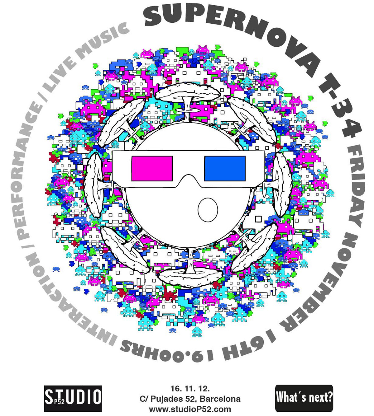 The end of the world is usually taken as a catastrophic event in which a big tsunami, a massive volcano, or an asteroid will hit the planet and make us disappear. The mayans believed that the end of the world refers to the end of a thousands of year cycle, in which we will enter in a new energetic era, and the world as we know it will change. If you think about the last 20 years, you can realize that it just happened, the world has changed, we have changed, and will continuing changing. In StudioP52 we just wanted to make a cool and new age excuse to organize one of our periodical events, which counted with a great set of artists, creators and performers from Barcelona and the world.